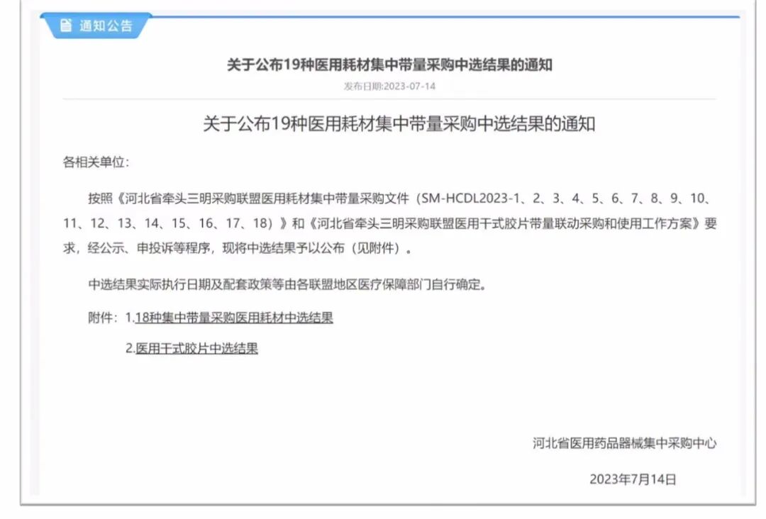 7月14日,河北省牵头三明采购联盟开展的19类耗材集采中选结果公布。