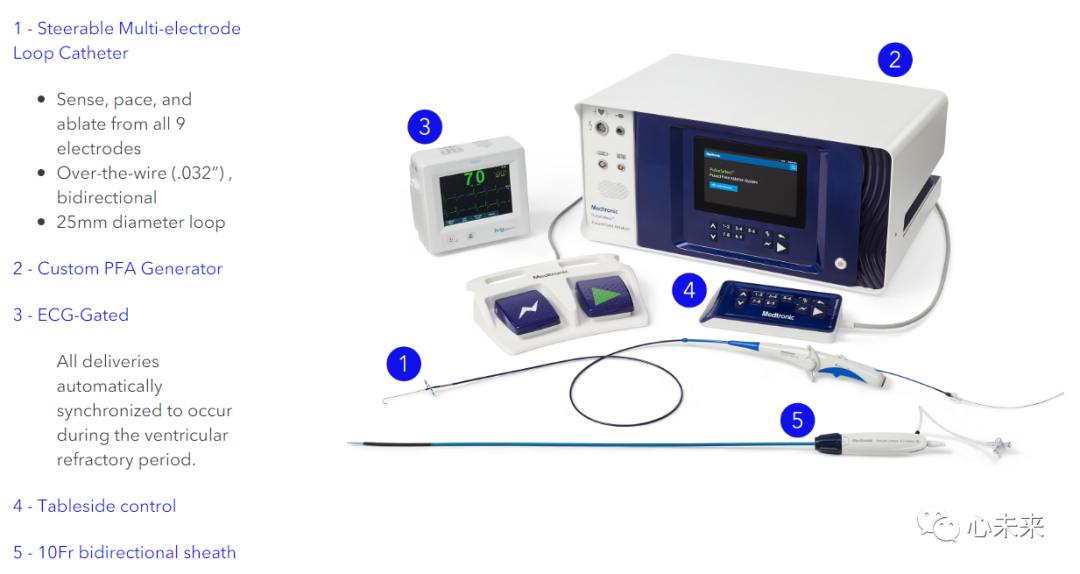 这款脉冲电场消融系统由可操纵的多电极环状消融导管、自定义FPA生成器、心电图、桌边控件、直径10Fr的FlexCath Contour™双向鞘管(尚未获得任何官方批准)五部分组成。